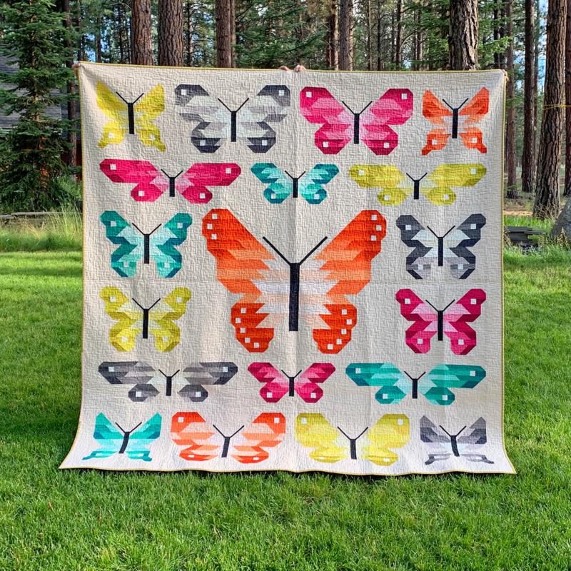 OverzichtLepidoptera is een quiltpatroon van Elizabeth Hartman met gestileerde vlinders. De vlinderblokken worden opgebouwd uit kleine stukjes stof die samen een grafisch en herkenbaar motief vormen.